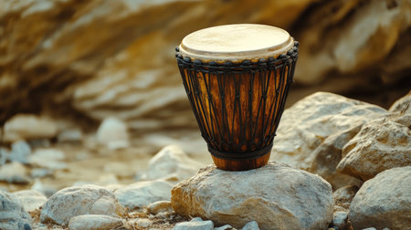 A beautiful traditional hand drum positioned on rugged rocks highlights the earthy elements of nature. This image captures the essence of music in an outdoor setting.