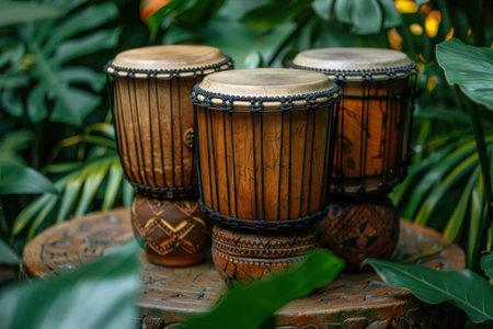 A collection of three djembe drums of different sizes placed on an outdoor table with lush tropical plants in the background.