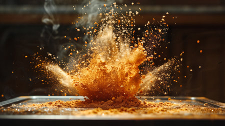 A stunning image capturing the dynamic explosion of fine powder against a dark background. This vibrant splash showcases texture and creativity perfect for culinary projects.