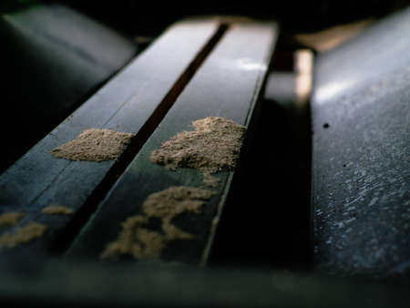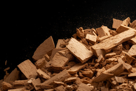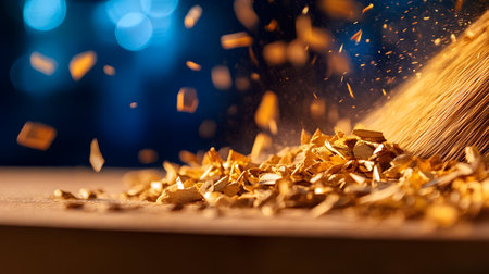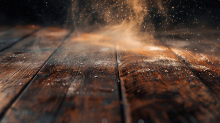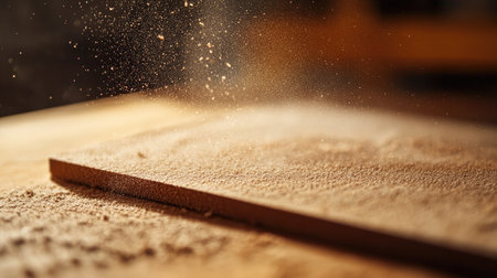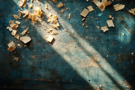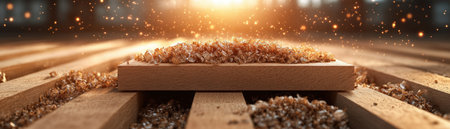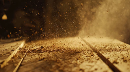 Close-up image showcasing wooden planks with scattered shavings and particles, illuminated by soft light for a captivating abstract composition.