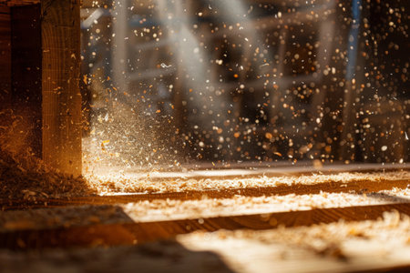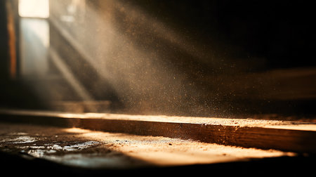 This vivid image captures dust particles dancing in sunlight over a wooden surface, creating a warm and inviting atmosphere perfect for woodworking and craftsmanship.
