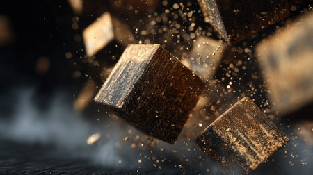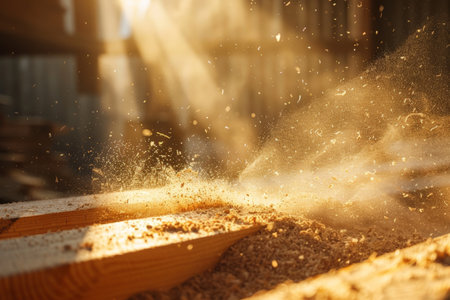 A captivating image showcasing a wooden block suspended in motion, surrounded by flying sawdust particles within a bright workshop setting, highlighting craftsmanship.