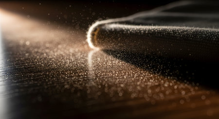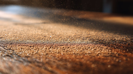A captivating close-up of golden dust resting on a wooden surface, illuminated by soft sunlight, creating a warm and tranquil atmosphere.