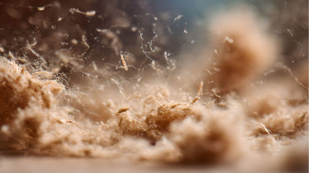 Detailed close-up of household dust, debris, and fibers, revealing the microscopic world of allergens and particles.