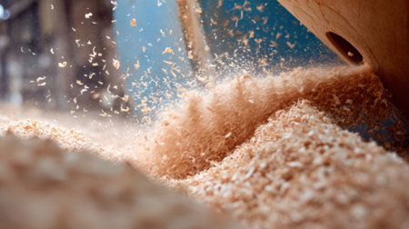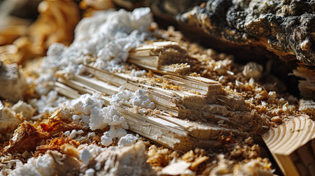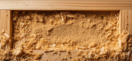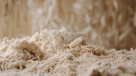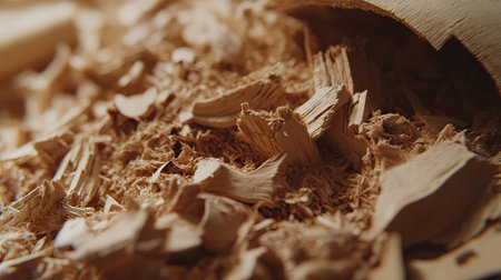 A detailed close-up view of light wood shavings and sawdust, showcasing the organic texture and natural fibers on a rustic surface, perfect for craftsmanship themes.
