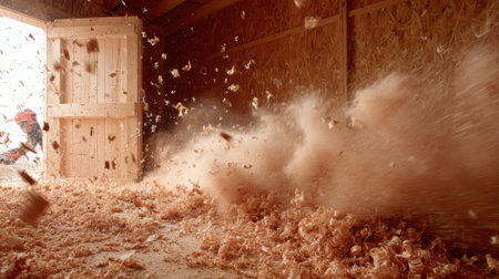 A dramatic capture of wood particles and dust erupting in a workshop setting, showcasing the dynamic energy of woodworking processes.
