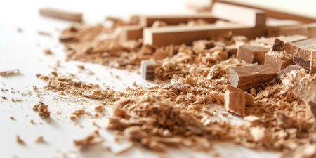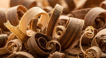 A close-up view of fine wood shavings scattered on a surface, illuminated by soft light, perfect for showcasing craftsmanship and woodworking processes.
