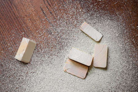 closeup of cut pieces of wood with sawdust on brown wooden floor