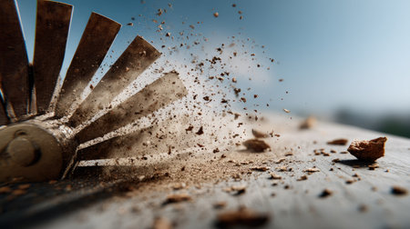 A stunning close-up image showcasing fine particles of wood scattering dynamically as a disc bursts through the surface, creating a captivating motion effect.