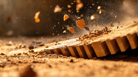 This captivating image showcases the dynamic explosion of wood particles in the air, with sparkling dust and fine chips creating an engaging visual spectacle.