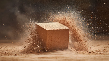 This captivating image showcases a wooden block creating a dynamic dust cloud, highlighting the interplay of movement and texture in an artistic natural setting.