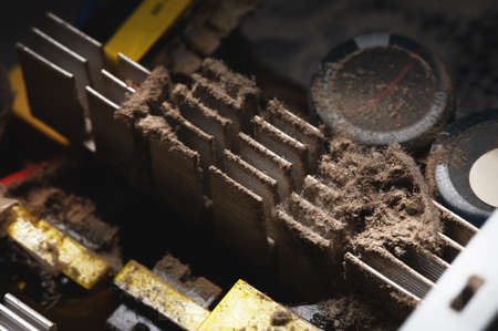 Dust and dirt on the pc processor cooling heatsink. Close-up