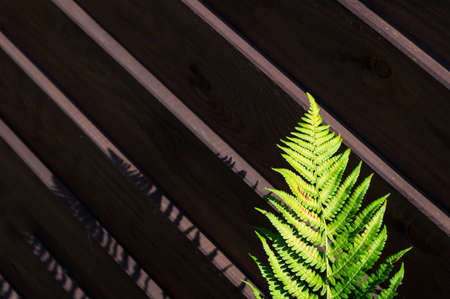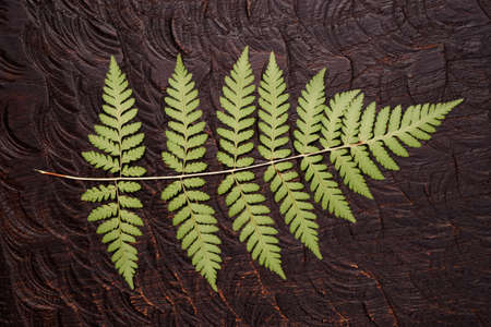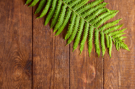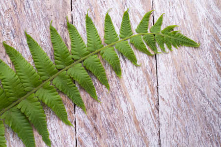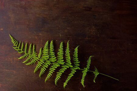 A concept of minimalist lifestyle, delicate green fern leaf on old wooden table background. Top view with copy space. Flat lay