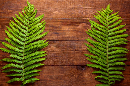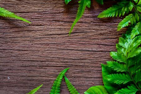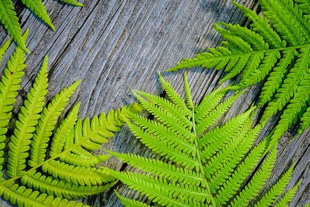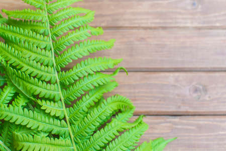 Green fern leaves wooden background. Green sprigs of fern with leaves wooden background with place for text. Symbol Wildlife Ecology.