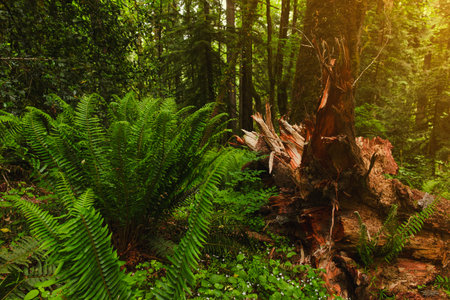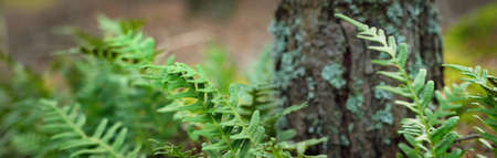 Bright green young fern leaves close-up. Old tree in the background. Early spring in a mossy evergreen forest. Natural pattern. Warm sunlight