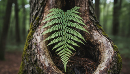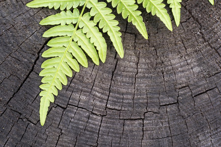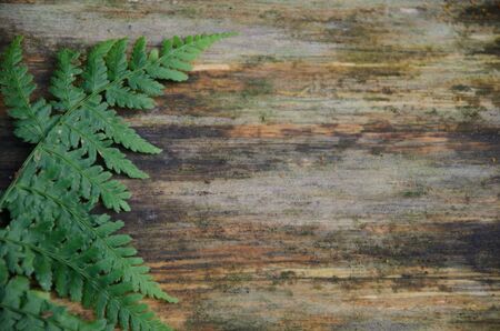 the isolated green leaf of a fern on an old wooden stump closeup and a blank space