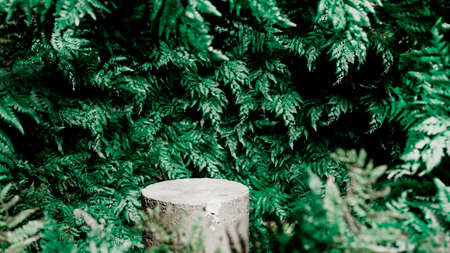 Stone podium display in the nature background of green ferns. Copy space green background. Beauty cosmetics product mockup. Natural concrete pedestal. 3d rendering