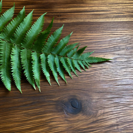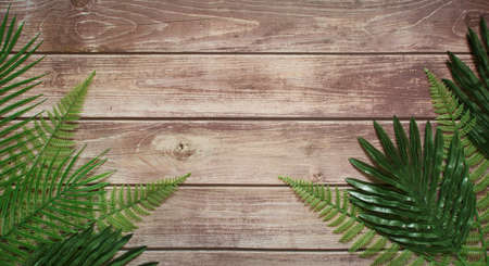 Fern leaves on a wooden background. Top view. Place for text. Green tropical plant branch.