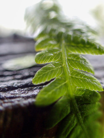 Fern. Wildlife concept on wooden background. Perfect natural fern specimen. Beautiful background of young green fern leaves.