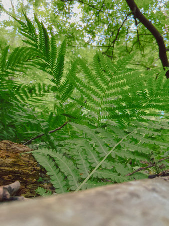 Ferns. Forest plants on a sunny day in June. Close-up of a leaf on a blurred background.