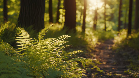 Soft sunlight cascades through a serene forest, illuminating lush green ferns. Morning mist hangs in the air, creating a peaceful atmosphere in this natural paradise.
