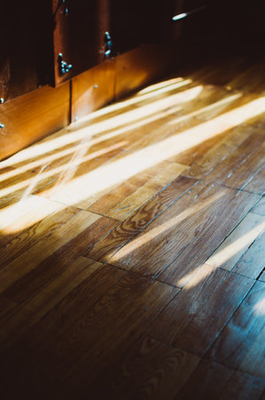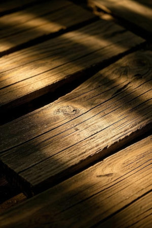 Atmospheric image showcasing rustic wooden planks with a shallow depth of field, enhanced by a bokeh effect of golden dust particles hovering in the background light.