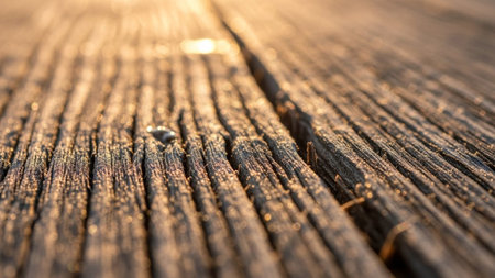 Close-up view of weathered wooden planks with deep cracks, illuminated by warm golden hour sunlight creating...