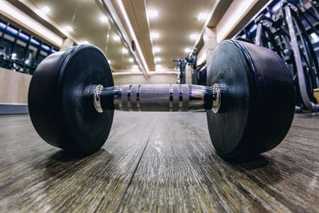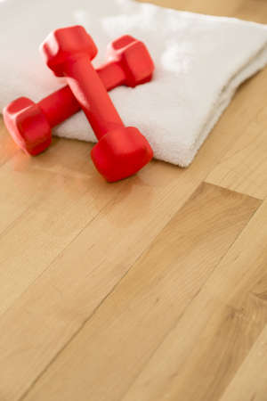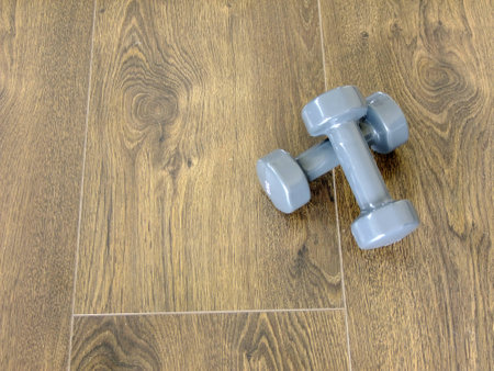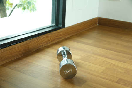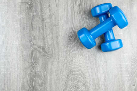 Training at home fitness concept: dumbbell weights on wood floor at fitness gym . Weight loss and health. Sport fit lifestyle.