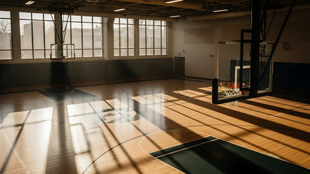 School gym floor. Wooden floor of sports hall with colorful marking lines