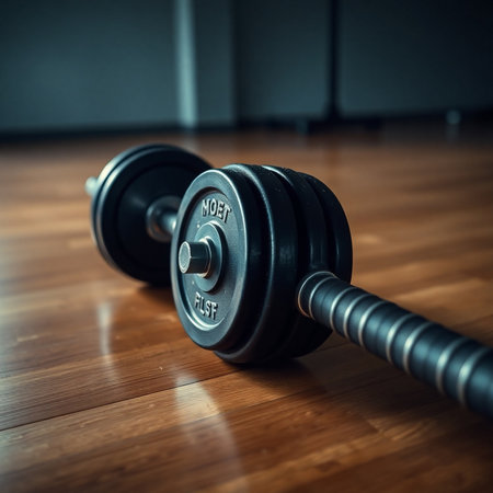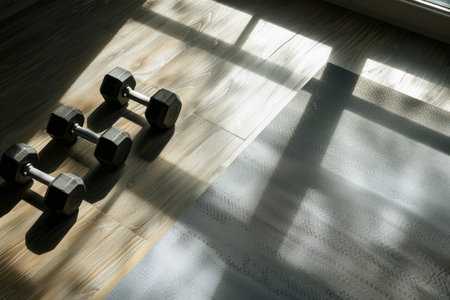 A cozy workout corner featuring a pair of dumbbells and a neatly rolled yoga mat on warm wooden flooring, inspiring balanced fitness sessions.