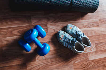 Dumbbells for fitness on mat and sneakers. Gym accessories. Copyspace. Selective focus.