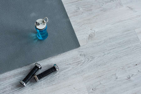 Fitness at home, equipment and tools for gym at home, dumbbell and mat in living room on wooden floor