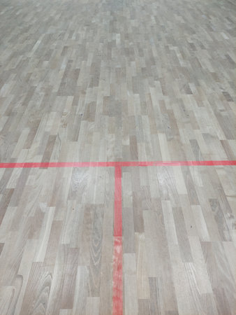 Wooden floor basketball, badminton, futsal, handball, volleyball, football, soccer court. Wooden floor of sports hall with marking lines on wooden floor indoor, gym court