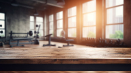 Empty wood table top on blurred abstract blur fitness gym background - filter color effect or display your products