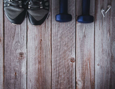 Fitness dumbbells with trainers and earphones on wooden background. Gym accessories. Copy space. Selective focus.