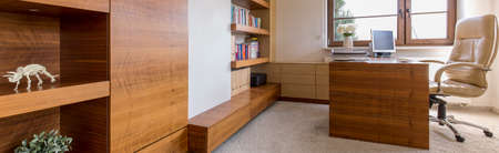 Spacious home office with solid wooden furniture and leather chair