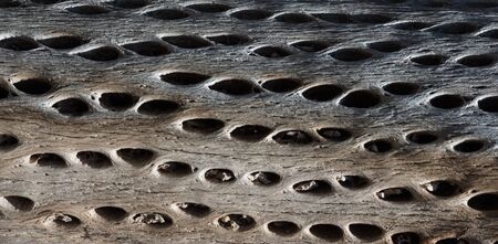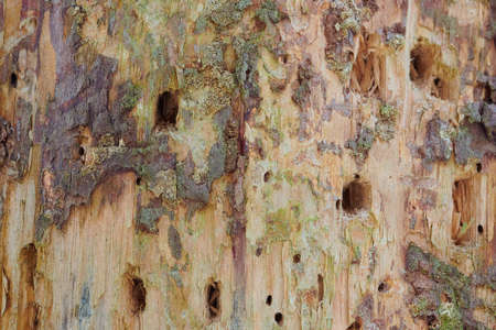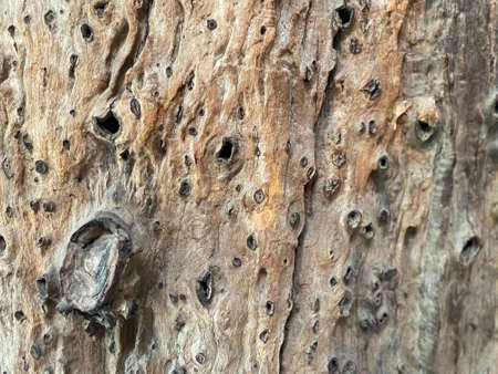The textured background with bark of tree with holes from insects and birds