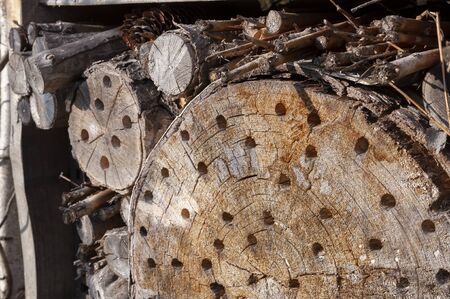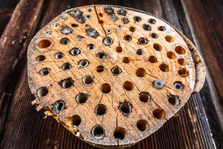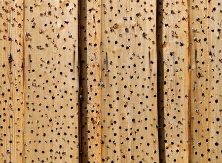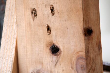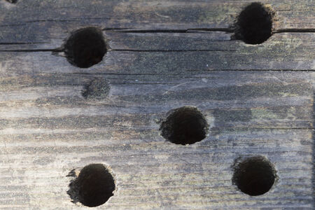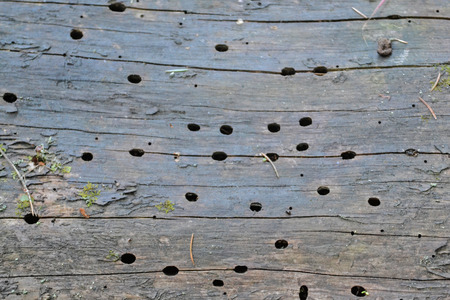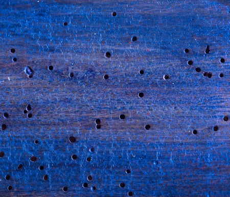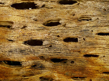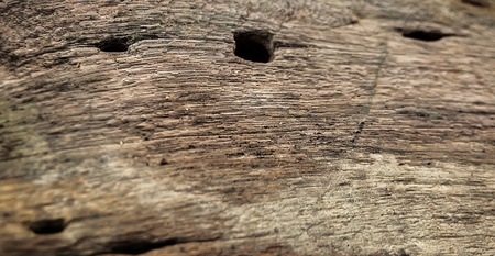 Surface of wood with holes were made by larvae