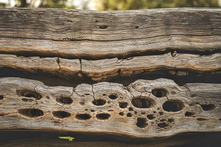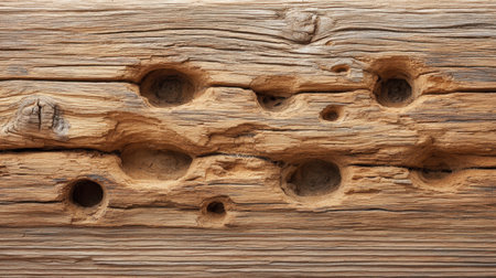 This close-up image showcases a weathered wood surface with unique holes and textures, ideal for themes such as rustic decor, nature, and artistic designs.