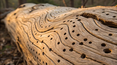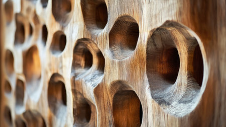 This striking close-up image showcases a textured wooden surface featuring intricate hollow patterns that create a captivating natural design, perfect for artistic projects.
