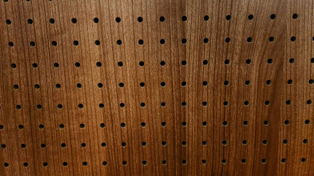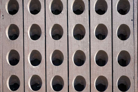background of wooden boards assembled together with oval shaped holes building a regular pattern