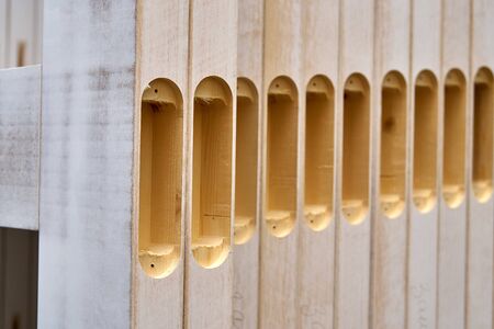 beautiful texture of wood rack with technological holes for wine and champagne bottles as background