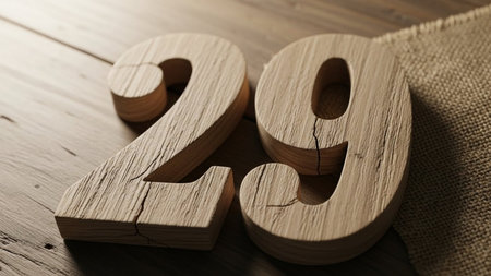The image features a close-up view of wooden numbers 2 and 9 placed on a rustic wooden surface. The numbers are crafted with a natural, unfinished look, enhancing their organic appeal. The background includes a burlap sack, adding to the rustic and handmade aesthetic.