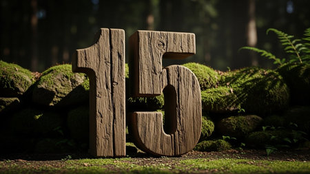 The image features a large, rustic wooden number five prominently displayed in a serene forest setting. The number is crafted from weathered wood, giving it a natural, aged appearance. It is surrounded by lush greenery, including moss-covered rocks and ferns, creating a tranquil and picturesque scene. The lighting suggests it is either early morning or late afternoon, casting a soft glow on the number and the surrounding foliage.