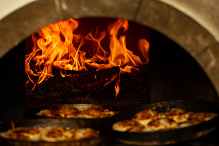 A pizza rests on a stone in a wood fired oven, with the fire heat cooking it to perfection. The traditional cooking method brings out the rich flavors of this Italian meal.