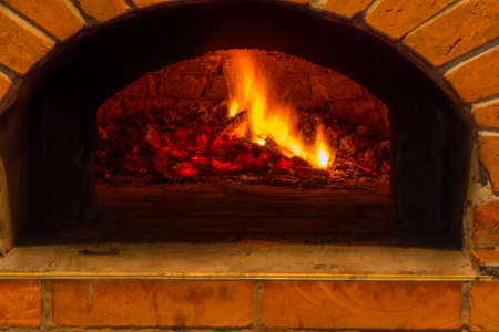 Firewood is burning, the stove is being heated. Red hot coal. Traditional wood oven in Naples restaurant, Italy. Original neapolitan pizza.
