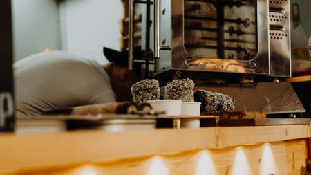 In a restaurant, pita or pita bread cooking in oven or stove. Bakery or bakehouse concept image.