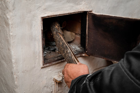 Unrecognizable man puts firewood in an old stove, a close up photo.