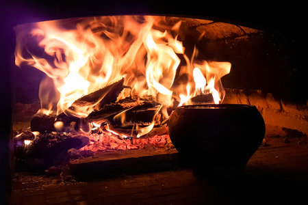 Cast-iron pot with water inside the Russian stove, fire flame, firewood and coals, traditional way of cooking