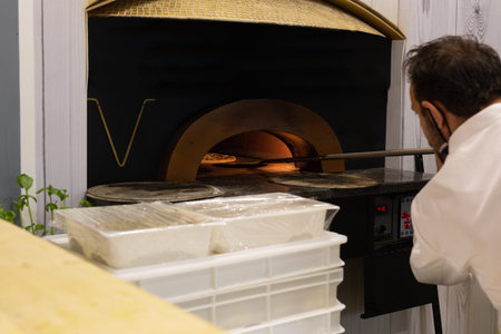 The chef prepares pizza in a neapolitan pizzeria. Cook in a apron in the kitchen with a shovel in his hands. boxes for food delivery on background. High quality photo